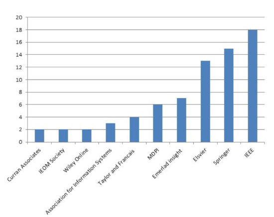 The descriptive statistics show that the top five publishers in the area of agility and Industry 4.0 include: IEEE, Springer, Elsevier, Emerald Insight and Multidisciplinary Digital Publishing Institute (MDPI). They published 59 papers, which constitutes more than 50% of all analyzed papers.