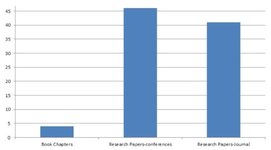As it can be seen in the figure, the conference papers take a lead by publishing 46 full papers, whereas there are 41 journal papers. Only 4 publications were published as chapters in books.