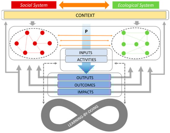 Effective collaborations in the adaptive governance of SES require that actors guide, control, manage, and steer environmental resources by considering both components, social and ecological. The literature recognizes that by increasing the social connectivity in SES, collaborative activities can improve effective management of the ecological component through the creation of flexible connections among stakeholders formalized in partnerships [20,69]. Connections require sharing of material and non-material resources, facilitating trust-building relations needed to resolve conflicts [17]. Connections can sustain adaptation and trigger sustainability transformations [8,30]. By identifying, formulating and implementing environmental project activities (P), actors can concretize environmental collaborations based on adaptive governance that are able to synergically consider both the social and the ecological systems (blue arrow), fostering governance activities that could be more fit-for-purpose [19] in producing outputs, outcomes, and impacts ([70] defines outputs as the tangible results made by activities that are relevant for the achievement of outcomes. Outcomes are defined as likely or achieved short-term or medium-term effects. Impacts are defined as positive or negative long-term effects produced by activities) (Figure 1) [71,72]. The results of projects could negatively or positively affect the context where they act and both the social and the ecological systems (grey arrows). Moreover, the ongoing learning-by-doing process fostered by evaluations allows identifying improvements in governance activities through an adaptive cycle as shown by dashed grey arrows (Figure 1) [30].