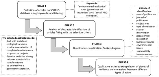 To understand how and under which conditions collaborations could contribute to effective adaptive governance of SES, we perform a systematic literature review through both a quantitative and qualitative analysis based on reliable and high-quality evaluations reported in the scientific literature [73]. The systematic review is performed to collect and synthesize pieces of evidence emerging from scientific articles focused on the results of the evaluations of environmental activities and extrapolate knowledge on collaborations in adaptive governance of SES [74]. We opted for a systematic review because it allows summarize existing and fragmented knowledge discussed in multiple scientific articles in order to handle the research questions in a sounder way [75]. Specifically, we want to reorganize the scientific knowledge that emerged from experiences already analyzed and evaluated by the scientific community, focusing on evaluating and fostering collaboration in adaptive governance. Steps constituting the literature review process are reported in Figure 2.