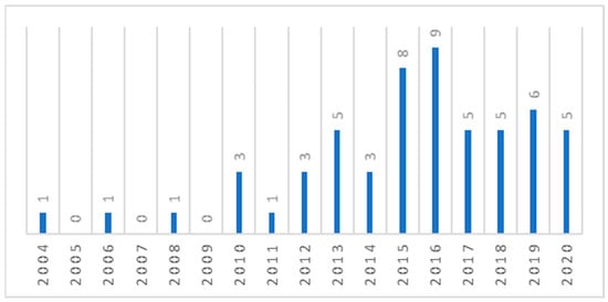 The analysis reveals that selected articles are relatively recent, and the oldest is published in 2004. Figure 3 shows that evaluations of environmental governance activities fitting with the research criteria are mostly published in the last decade, i.e., after 2010, with a maximum value in 2016 (nine articles published). Then, the number of articles reaches stability with five to six papers published every year.