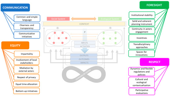 The selected articles offer several examples of evaluations of interventions dealing with the improvement of adaptive governance of SES through the identification of novel solutions. Examples of evaluations undertaken are: (i) ex-ante evaluations of the impact caused by specific types of land use in protected areas [89]; (ii) participative evaluations aimed at creating awareness on environmental issues [90]; and (iii) the identification of best practices for resilient environmental management [24]. The following paragraphs summarize the recommendations on how and under which conditions collaborations contribute to the effective adaptive governance of SES as highlighted and suggested by evaluation results. In order to facilitate the comprehension, the qualitative results are grouped into four categories having a common conceptual significance: (i) Communication, (ii) Equity, (iii) Foresight, and (iv) Respect. These categories and their main components emerged from the analysis of the articles are summarized in Figure 5.