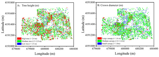 Spatial distribution of all saltcedar (Tamarix chinensis) trees with different tree heights (A) and different crown diameters (B) in the study area.