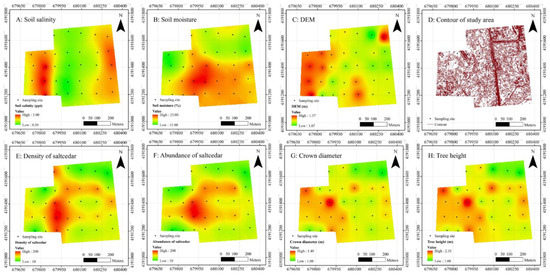 Maps of soil properties (A–D) and saltcedar (Tamarix chinensis) features (E–H) based on inverse distance weighting interpolation.