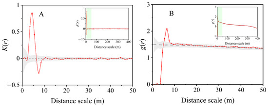 Univariate point pattern analyses of the spatial distribution of saltcedar (Tamarix chinensis) based on Ripley’s K function (A) and pair-correlation functions g(r) under a heterogeneous Poisson null model (B). The simulation envelopes (grey interval) correspond to the 5% and 95% confidence intervals. The insert figures describe the point pattern analysis of saltcedars at the maximum distance (400 m).