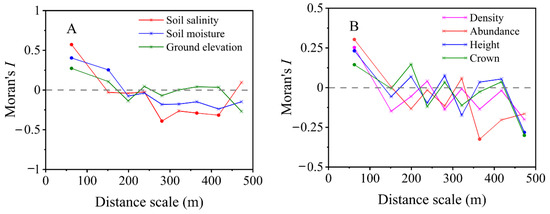 Both soil environmental factors and saltcedar features were significantly and positively spatially autocorrelated (Table 1). In this study, the longest boundary of the study area was 685 m and was divided into ten distance classes. The upper bound of each distance class was 125, 178, 221, 256, 305, 338, 391, 443, 502, and 685 m, successively. However, due to the large breadth of the class, the coefficients in the largest distance class were often unreliable [35]. After removing unreliable coefficients in the largest distance class, the correlograms of soil properties and saltcedar features at different distance scales showed that spatial autocorrelation decreased with the increasing distance (Figure 5). The spatial autocorrelation of elevation, soil salinity, and moisture all peaked in the 0–125 m distance class, indicating a significant positive spatial autocorrelation between closer points at 0–125 m. The spatial autocorrelation of the saltcedar population changed noticeably, especially for the abundance of saltcedar. Overall, soil properties and the saltcedar population showed a positive significant spatial autocorrelation up to 125 m.