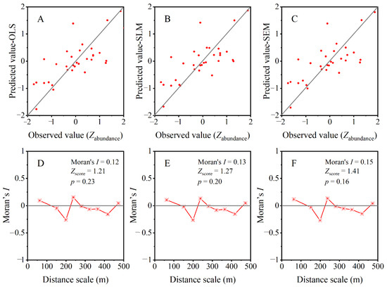 Performance of different regression models. Scatter diagrams between observed and predicted values of the abundance of saltcedars (Tamarix chinensis) are shown in the upper three panels (A: OLS; B: SLM; C: SEM). Nondirectional spatial correlograms for the residuals of different regression models are shown in the bottom three panels (D: OLS; E: SLM; F: SEM). Solid circles indicate the significant spatial autocorrelation (p < 0.05) and asterisks indicate the nonsignificant spatial autocorrelation. All correlograms were globally significant (p < 0.05).