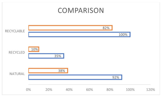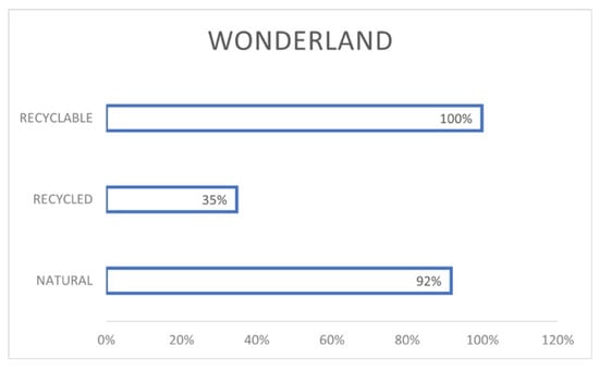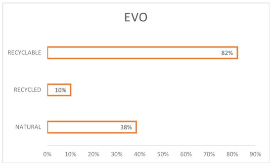 Based on the weight of each material and in relation to its value in the triad of characteristics taken into consideration, an overall result for the EVO model was obtained by calculating the weighted average, resulting in the following: natural materials 38%, recycled 10%, and recyclable 82% (Figure 1).