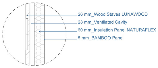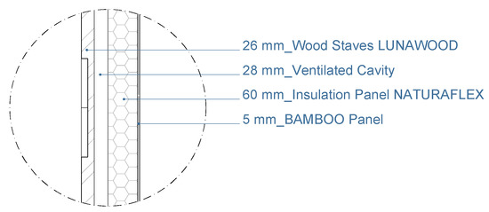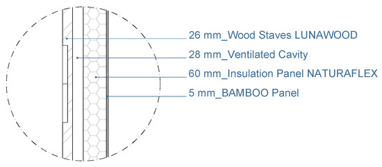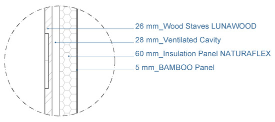 The façade was realized with coniferous wood staves (Jukola 3D by Lunawood, Lahti, Finland) which are PEFC certified. The wooden staves are heat-treated at high temperatures (between 190–192 °C) through heat and steam processes, thus making the wood resistant to unfavorable external climatic conditions without the addition of further treatments based on chemical substances such as solvents or paints. Each stave is 30 mm thick with rabbet joints making the application easy. The staves are screwed to wooden batons attached to the underlying wooden structure, leaving an adequate air chamber 30 mm thick to ensure ventilation of the façade. The pattern that characterizes the façade has been realized through a numerical control machine giving a 3D surface.