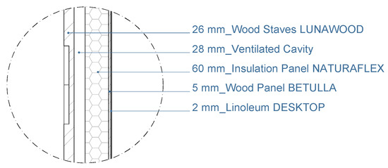 The inner finishing layer is realized with bamboo panels 5 mm thick (Figure 3) or linoleum (Figure 4) 2 mm thick, all supported by a multilayer birch pane, which are the same materials chosen for the furniture and the partition walls and they will be analyzed further ahead.