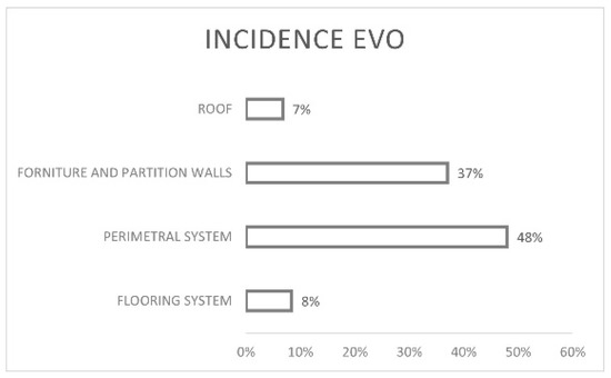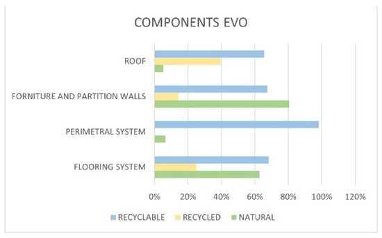 The minimum thresholds in relation to the percentage of recycled and recyclable present within the product and materials are indicated in the annex dedicated to construction: 50% of the components must be disassembled, of which at least 15% that cannot be traced back to the supporting structure [13]. In the case of mobile homes, which are developed with dry technology, it is easier to achieve this goal for which a goal of 99% was set starting from a base of 82% (EVO).