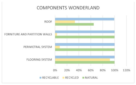In a view of ecological and healthy design, the objective of the research was to improve the industrial product of the mobile home. Three factors referred to materials mainly influenced the research: naturality, to be recycled, and recyclability of the materials. The challenge was to calculate the percentage of the three factors of a standard mobile home and compare it to the new sustainable product in order to understand if it is possible today to introduce innovative and eco-friendly materials in the current assembly line. The percentages were calculated on the volume of each material, which allowed us to also keep in consideration the light materials. First, we calculated the percentage of naturality, been recycled, and recyclability for each component of the mobile home: flooring system, perimetral system, and roof system. The result was that compared to the current mobile home, with the new materials, it is possible to obtain 100% naturality for the flooring and perimetral system and that all the components are 100% recyclable, excluding the roof system, which is 99% recyclable. This means that for most of the components, the percentage doubled. At the end, we compared the percentages of the three factors on the mobile homes in total. The result was that the mobile home actually in production is 38% natural, 10% recycled, and 82% recyclable, while the same mobile home but with eco-friendly materials is 92% natural, 35% recycled, and 100% recyclable (Figure 7 and Figure 8). This means that the sustainable mobile home is a healthy product thanks to its naturality and is built with a future perspective of the closed circulation of its components.