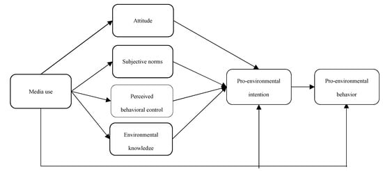 Some studies have also investigated the indirect effect of media use on intention and PEBs through cognitive mediators such as environmental knowledge, subjective norms, and PBC [86,87,98]. For instance, Liu et al. [65] concluded that Internet use not only directly affects PEBs but also indirectly influences PEBs through the mediating effects of environmental knowledge. It is also common to examine the mediator effects in predicting the PEBs within the TPB framework [99,100]. For example, Bamberg and Möser [56] proved in a meta-analysis study that environmental intentions would mediate the effects of psychosocial variables on PEBs. Thus, it is also assumed in the present study that pro-environmental intentions mediate the relationship between media use and attitude, subjective norms, PBC, environmental knowledge, and media use. Furthermore, attitudes, subjective norms, PBC, and environmental knowledge mediate the relationship between media use and pro-environmental intentions.