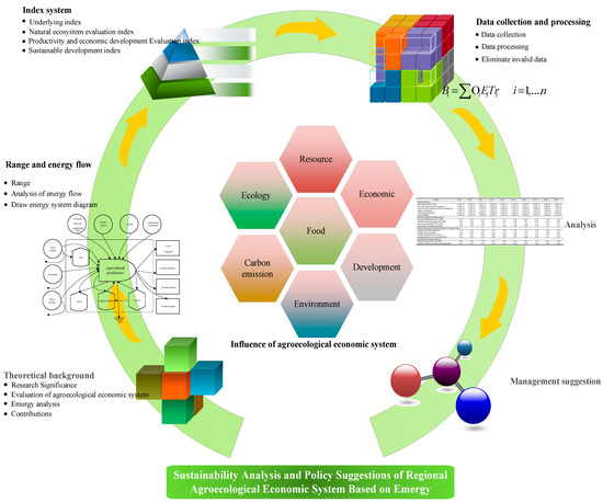 The innovations of this study are as follows: (1) we constructed a standardized scale to process regional agroecological economic system input-output data using the emergy analysis method which directly reflects the energy flow relationship between system elements; (2) we established an emergy evaluation indicator system for the regional agroecological economic system to evaluate its ecological benefits and sustainability; and (3) we proposed targeted policy recommendations and management insights based on our evaluation.