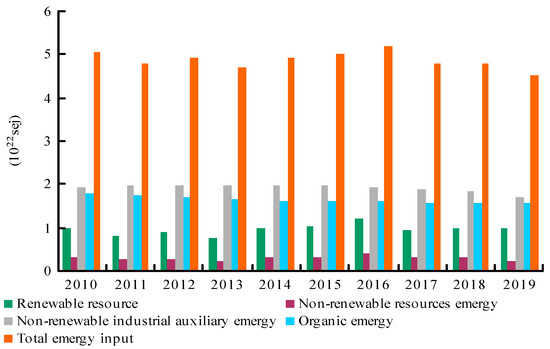 Emergy inputs of the agroecological economic system in Anhui Province, 2010–2019.
