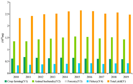 The total emergy yield in Anhui’s agroecological economic system from 2010 to 2019 averaged 2.52 × 1023 sej, with a low of 2.33 × 1023 sej in 2010 and a high of 2.65 × 1023 sej in 2015. The increase from 2010 to 2015 was most prominent. After 2015, there was a fluctuating downward trend going from 2.65 × 1023 sej in 2015 to 2.47 × 1023 sej in 2019 (see Table 5, Figure 5). Among the emergy output values in the last 10 years, animal husbandry (average of 1.46 × 1023 sej) has the highest emergy, followed by crop farming (average of 6.30 × 1022 sej); animal husbandry and crop farming accounted for 58.01% and 25.01% of the total emergy output, respectively (see Table 4). These results show that the agricultural output of Anhui Province is still dominated by animal husbandry and crop farming, indicating evident regional characteristics. Anhui Province is an important grain producer in China. Since forest land in Anhui Province is mainly used as ecological forests and the amount of freshwater is small, the emergy output of forestry products and fishery products are small, which together only accounted for 17.05% of total emergy.