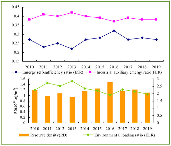 The ELR of the agroecological economic system in Anhui Province has been low and decreasing between 2010 and 2019, with an average of 2.32, a maximum of 2.85 in 2013, and a minimum of 1.88 in 2016 (see Table 5, Figure 6). These values show that the environmental pressure on the development of the agroecological economic system is low, which will benefit its sustainable development. Anhui Province enjoys a monsoon climate of medium latitude and good water and heat conditions. The resource density (RD) has been maintained at above 0.94 × 1011 sej/m2, with a maximum of 1.48 × 1011 sej/m2 in 2016 and slight changes between years. This resource will produce good economic and ecological benefits for Anhui’s agroecological economic system.