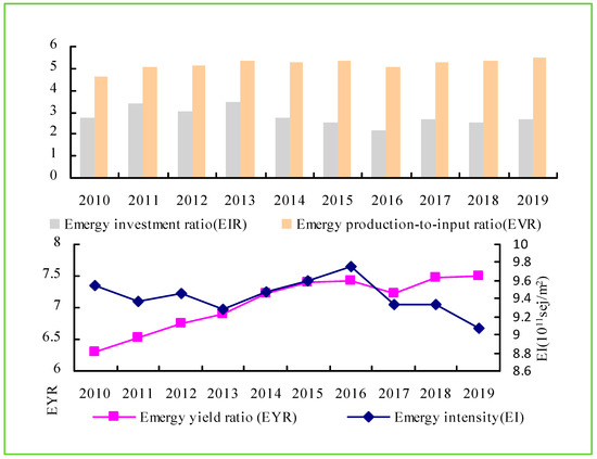 Since 2010, the average emergy intensity of the agroecological economic system in Anhui Province has been 9.42 × 1011 sej/m2, which is relatively high; this indicates a high level of agricultural development in Anhui Province. The system’s average emergy production-to-input ratio (EVR) since 2010 has been 5.19, with the lowest in 2010 and the highest in 2019, which indicates that the production efficiency of the agroecological economic system is high and yields high economic and social benefits.