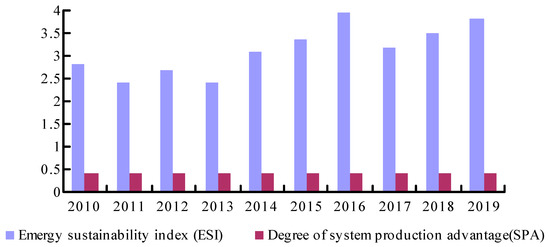 From 2010 to 2019, the ESI of the agroecological economic system in Anhui Province averaged 3.12, with the highest being 3.95 in 2016 and the lowest being 2.38 in 2011 (see Table 5, Figure 8). The sustainability index showed a fluctuating increase from 2010 to 2019, which indicated that the agroecological system has a strong potential for sustainable development that is increasing.