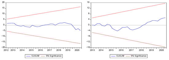 According to Pesaran, Shin and Smith [35], we estimated the long-run parameters and coefficients of the variables of interest. Table 4 and Table 5 provide the long- and short-run estimates of both countries, respectively. For the long-run estimates, the direction and magnitude of coefficients are provided with statistical significance in Table 4. Additionally, both econometric models are stable and provide robust results as the diagnostic tests for normality, heteroskedasticity, and serial correlation are statistically insignificant.