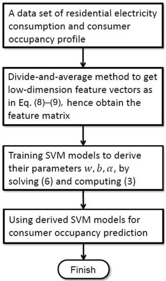 To employ SVM for the analysis and prediction of energy consumer occupancy, a feature vector must be constructed based on the consumer electricity consumption. There may be multiple ways to do so, however in this research we directly use the consumer electricity consumption profile for constructing SVM feature vectors. The SVM feature vector length is determined by the electricity consumption data resolution and the time period for occupancy prediction. For instance, if the occupancy should be inferred each 15-min period and the electricity consumption data resolution is 1-minute, then the SVM feature vector length is 15. More specific will be illustrated in Section 3.3.
