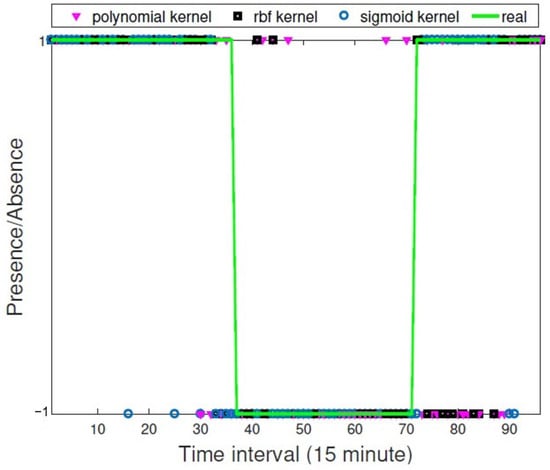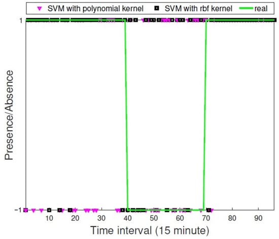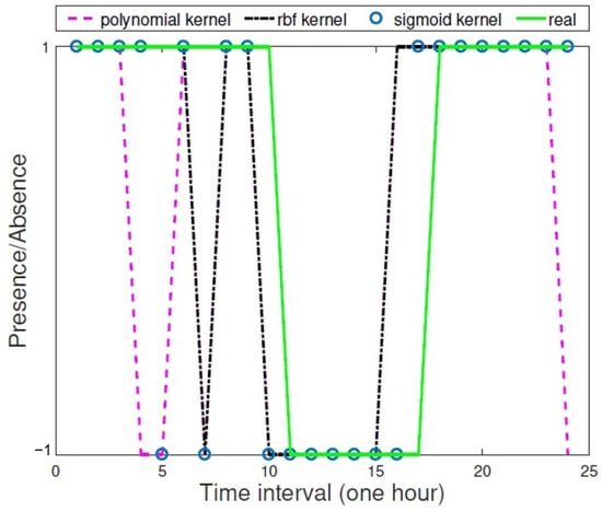 Consequently, we use the above SVM models to predict the occupancy profile in the considering home for the last weekday. It then turns out that the result of linear kernel is totally wrong with 100% of consumer’s presence, while the outcomes of polynomial and rbf kernels are much better, which are shown in Figure 3, because the residential electricity consumption data are not linearly separable. The sigmoid kernel, a CPD kernel [], is also tested but its performance is not good, hence we do not show its result in Figure 3 to guarantee the figure clarity. Performance comparison of polynomial and rbf kernels is exhibited in Figure 4. As seen, the SVM model with polynomial kernel is worse than the SVM model with rbf kernel at some indexes but is better at some other indexes. In addition, the former is less accurate than the latter in predicting the presence of the energy consumer but is more accurate in predicting her absence.
