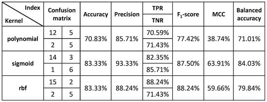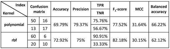The TNR, MCC and balanced accuracy are employed to better evaluate the performances of SVM models since the precision, TPR, and F1-score indexes focus only on the positive predictions, but not on the negative ones.