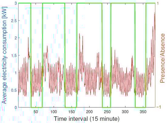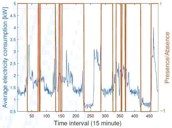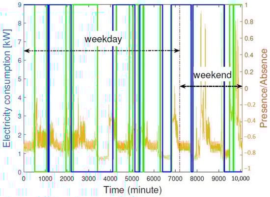 In residence and office buildings there is a strong correlation between the energy consumption and the occupancy of consumers. In particular, energy consumption peaks usually occur at time intervals during which consumers stay at their homes or offices [,,]. Hence, consumer occupancy is one of important factors that has useful social implications. Examples include the establishment of more efficient energy management systems (EMSs) by means of better demand response (DR) programs [], more economic operation of HVAC systems [], energy saving buildings [], of upgrading suggestions for energy systems [], etc.