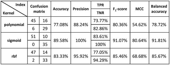 The results of the second simulation are depicted in Figure 6, where the sigmoid kernel is also used. The performance comparison of SVM models with different kernels in this case is shown in Figure 7. We can clearly observe that the SVM models with sigmoid and rbf kernels outperform that with polynomial kernel in this scenario in all performance indexes. On the other hand, the performances obtained with rbf and sigmoid kernels are slightly different in this case, but we note that with some other sets of parameters for the sigmoid kernel, their performances become identical.