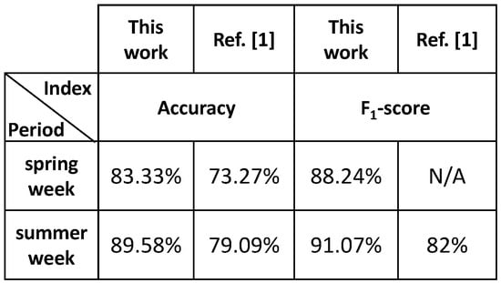 In this section, we attempt to compare the performance of our proposed approach with that of an existing algorithm in the literature [] conducted on the same dataset. Note that, the algorithm in [] was also simple and threshold-based. The prediction results in [] were evaluated through the confusion matrix, accuracy, TPR, precision, and F1-score indexes, and could be improved by combining different metrics (average power, standard deviation, and power range).