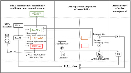 - UAI (Urban Accessibility Indicators) represents the set of urban elements of accessibility, consisting of a set of key accessibility indicators that are considered basic for a street segment to be part of an accessible route in consolidated urban areas. From the set of UAI indicators, Key Performance Indicators (KPIs) are selected, which form a unique subset of high-level indicators related to the strategic objectives in the evaluation of the accessibility of urban environments [77];KUAI represents the measure of compliance with the set of accessibility indicators (UAI) in a street segment according to the different categories of indicators defined;Q is the set of rules that defines how the KUAI is classified according to the result obtained. It therefore represents the classification of urban spaces according to the value obtained (KUAI) of compliance with the categories of indicators.