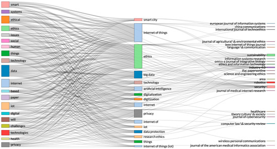 Since we could not find records that included all search keywords on ethics, shared responsibility, health policy, and IoT, we had to separate the search keywords. Even before we applied statistical software to these results, we knew that these research records would not be directly related to shared responsibility and health policy. Instead, we used the data records to visualise the connection between different keywords.