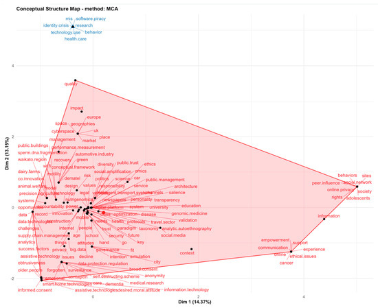 From the three-fields plot in Figure 1, we can see that in the data records on ‘Internet of Things, AND ethics’, the topics of shared responsibility and health policy are not represented. The only related category is healthcare. From the abstract and article keywords, extracted by the ‘bibliometrix’ package, the topics of privacy, data protection, and risk are of relevance to health policy and IoT. In addition, the topics on ethical awareness, transparency, and accountability are missing. To analyse this data record with a different bibliometric approach, we used factorial analysis in Figure 2.