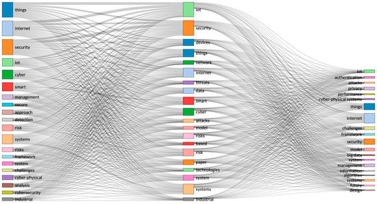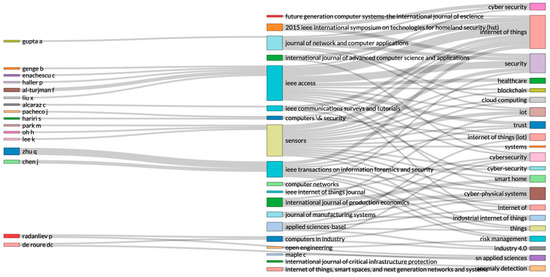 We designed an alternative three-fields plot (in Figure 4) and separated the field by journal sources, keywords from articles, and most relevant publications (chosen by the R ‘bibliometrix’ package). Since this data record was on IoT and cyber risk, we were trying to find reference and some connection to health policy. The closest we found was ‘healthcare’ (see Figure 4).