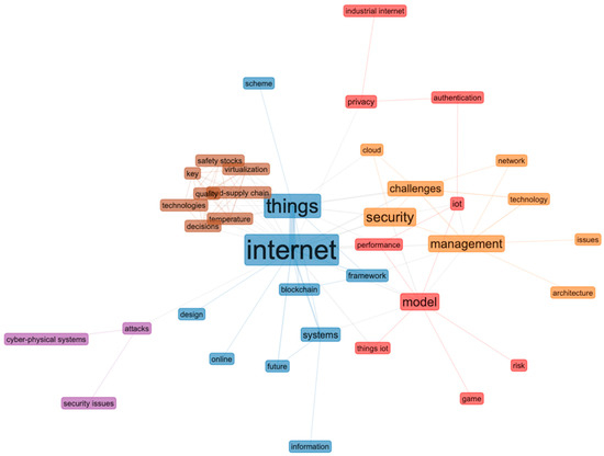 From the bibliometric analysis in Figure 3 and Figure 4, we can see that the topics of IoT, risk, ethics, and healthcare are present in research studies, but the connection between these topics is still in its infancy. To analyse this further, we designed a co-occurrence network (in Figure 5). In the co-occurrence network, we deleted isolated nodes and we tried to visualise how different research topics are related.