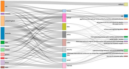 Bibliometric analysis—three-fields plot from the data record on ‘ethics, AND cyber risk’, relating research papers by country on the left, by source on the right, and by common words association from the records’ abstracts in the middle field.