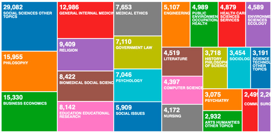 What the categorisations in Figure 8 and Figure 9 show is that scientific research on ‘ethics, OR cyber risk’ is strongly present in the research areas on social sciences, but there are also a significant number of records on medical ethics and healthcare sciences. The categorisations in Figure 8 and Figure 9 also show that scientific research on ‘ethics, OR cyber risk’ is predominately undertaken by academic and not military institutions. Some of these academic institutions also lead the research in ethics, shared responsibility, health policy, and IoT.