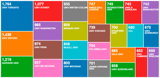 To identify if the research on ‘ethics, OR cyber risk’ is related to shared responsibility and health policy of IoT systems, or also predominated by the research sources on ‘military’ and ‘war’ as identified in the Figure 6, we also categorised the 155,931 records in research areas (in Figure 8) and institutions (in Figure 9).