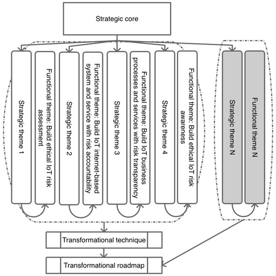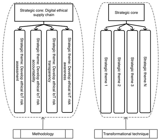 The diagram in Figure 15 presents a graphical analysis of the framework as a transformational technique that can be applied as a methodology in practice. The graphical analysis represents the step-by-step description of the ethical ‘nominal’ strategy emerging from the findings from decades of research on ethics, shared responsibility, health policy, and IoT. The process in Figure 12 and Figure 13 enables identifying and relating the functional themes behind individual strategic themes (as described in Figure 12). To verify the design, open coding was applied to provide a ‘nominal’ representation [18], while categorical coding was applied to identify the profounder concepts [12].