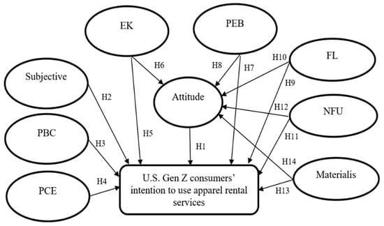 Even though the TPB is based on the assumption that one’s intention to perform a particular behavior is determined by attitude, subjective norms, and perceived behavioral controls, there is increasing evidence to support the inclusion of new constructs to the TPB that are specific to various domains not included in the original model [,]. The present study included six additional constructs, which were perceived consumer effectiveness (PCE), environmental knowledge (EK), past environmental behavior (PEB), fashion leadership, need for uniqueness, and materialism, to better explore the determinants for Gen Z’s intention to use apparel rental services. These constructs were identified to be significant in affecting consumer environmentally friendly purchase intentions or behaviors.