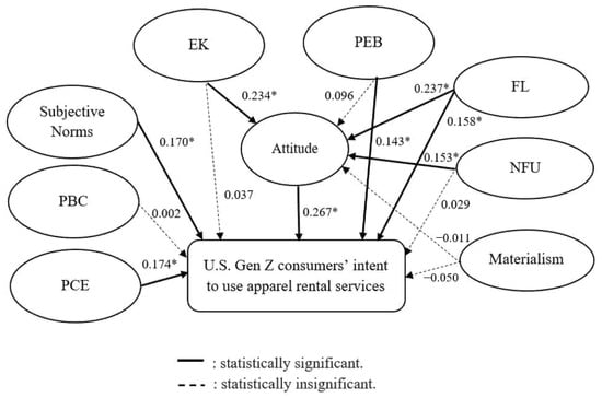 Specifically, attitude (AT) positively affected Gen Z consumers’ intention to use apparel rental services (β = 0.267, t = 5.033), supporting H1. This indicated that Gen Z consumers who show positive attitudes toward renting apparel are more likely to use the service. Subjective norms (SNs) were found to positively influence Gen Z consumers to use apparel rental services (β = 0.170, t = 2.995), supporting H2. This indicated that important persons, such as close relatives and friends, as well as influencers, play an important role in motivating Gen Z consumers to try apparel rental services. Perceived behavioral control (PBC) did not show a significant impact on Gen Z consumers’ intent to use apparel rental services (β = 0.002, t = 0.045), not supporting H3. The perception of their ability to use apparel rental services was not a major concern for US Gen Z consumers. Perceived consumer effectiveness (PCE) significantly affected Gen Z consumers’ intent to use apparel rental services (β = 0.174, t = 3.644), supporting H4. This revealed that the higher level of belief that an individual’s efforts matter in environmental protection leads to a greater likelihood for Gen Z consumers to use apparel rental services instead of buying more apparel. This finding corroborates the previous studies that reported PCE as one of the most influential predictors for consumers’ eco-friendly purchase intentions [,,].