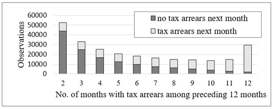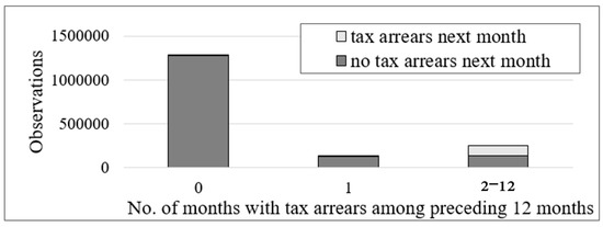 As provided in Section 3.1, the approach used in this paper for reducing the overwhelming proportion of zero values among the monthly tax arrears was to build machine learning models only for observations which had tax arrears in at least two among any of the 12 preceding months, while the rest of the observations were always predicted not to have tax arrears in the next month. This was justified because, among observations with previous tax arrears in zero or one months, the probability of tax arrears in the next month was very low (0.77% and 6.69%, respectively), and due to all or nearly all monthly figures being zero, they were difficult to predict (see also Figure 1 and Figure 2).
