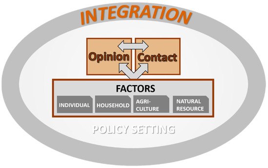 According to the scientific literature and theoretical foundations, Figure 2 shows our conceptual framework. Refugee integration into a host society is paramount. It is based on a country’s policy setting. Our analysis focused on public opinion and contact, which are key components of integration. These elements interrelate and depend on a range of factors. We applied a unique set of 15 factors. This includes a number of common variables from the European and African-specific literature, such as age, education and the distance to a camp. The other determinants are novel and of particular importance in the Zambian host community, including food access, land and livestock ownership, and fish and firewood use. We organized the set of factors into four groups: individual, household, agriculture and natural resource.