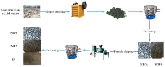 The specific processing flow is demonstrated in Figure 1. The details are as follows: (1) Use a jaw crusher to simply crush the waste concrete. (2) Sieve the crushed products with a shaker, and return the particles >31.5 mm to the jaw crusher for crushing again. Repeat operation (2) until the particle size of all products is <31.5 mm. (3) SCRFA with particle sizes of 0.075–4.75 mm and SCRCA with particle sizes of 4.75–31.5 mm were obtained by sieving simple-crushing products with a shaker. (4) The simple-crushing products were placed in the particle-shaping machine for treatment, and the particle-shaping products at the discharge port of the particle-shaping equipment were collected. The particle-shaping products were screened and graded by a vibrating screen. RP with a particle size <0.075 mm, PSRFA with a particle size of 0.075–4.75 mm, and PSRCA with a particle size of 4.75–31.5 mm, were obtained.