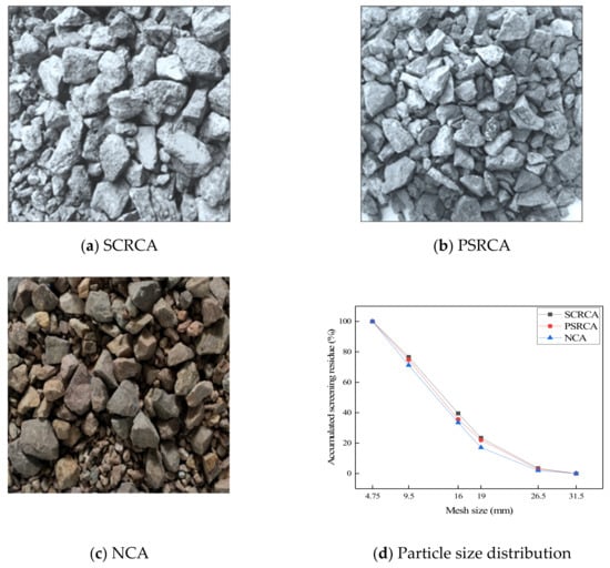 It can be observed from Table 6 that the performance of PSRCA is effectively improved after SCRCA is processed by particle-shaping. Compared with SCRCA, the powder content, mud content, 1 h water absorption rate, 24 h water absorption rate, needle-like particle content, and crushing index of PSRCA are reduced by 42.1%, 66.7%, 26.1%, 37.8%, 33.3%, and 16.7%, respectively. The apparent density has increased by 1.6%. The performance index of PSRCA is slightly lower than that of I class RCA, other indexes are upgraded from II class to I class, and its particle size distribution is also closer to NCA. Combining the coarse aggregate images of different processing states in Figure 2, it can be observed that this is caused by the removal of the mortar attached to the PSRCA surface after being processed by the particle-shaping equipment [,,]. In addition, it can be observed from the particle size distribution diagram that after the particle-shaping treatment, the cement paste on the surface of the SCRCA is peeled off and the sharp edges and corners are polished, which reduces the proportion of large-size aggregates in the PSRCA.