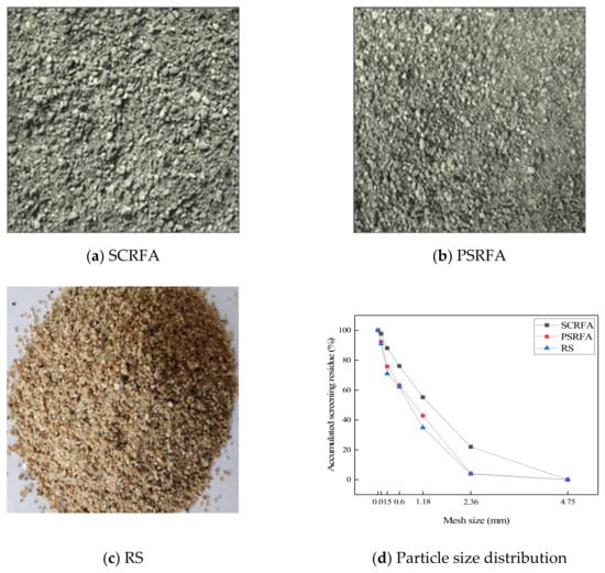 The main physical properties of SCRCA and PSRCA are displayed in Table 6, and the appearance and particle size distribution are displayed in Figure 2.