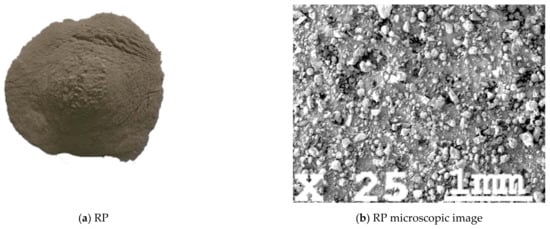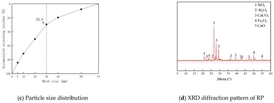 The chemical composition analysis of the RP produced during aggregate processing is displayed in Table 8, and the appearance morphology, microscopic image, particle size distribution, and XRD diffraction pattern are displayed in Figure 4.