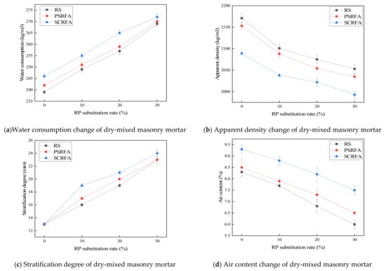 In addition, further analysis of Figure 5 shows that in dry-mixed masonry mortar prepared with different fine aggregates, with the increase of RP substitution rate, the water consumption and stratification degree increase linearly, while the apparent density and air content decrease gradually. This is due to the relatively loose RP, poor geometry and gradation, and a large number of connected pores in the particles, so that the dry-mixed masonry mortar can still absorb part of the water after the mixing is completed [,]. To meet the consistency requirements of dry-mixed masonry mortar, after the RP replacement rate increases, the amount of mixing water must increase. However, with the increase of water consumption, the water holding capacity of mortar decreases, and the fineness of RP is small; the density of each component is uneven. With the increase of the RP substitution rate, the low-density powder will float up in the process of vibration, which makes the stratification degree of dry-mixed masonry mortar increase and the apparent density decrease. In addition, RP also contains large quantities of SiO2, Al2O3, and Cao, and its chemical composition is similar to that of fly ash. Therefore, RP has certain pozzolanic activity, which can have filling and activity effects []. This will reduce the existing space of bubbles in the mortar and air content.