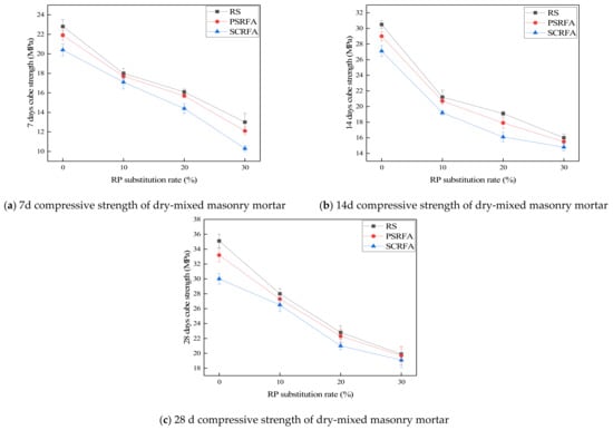 The curve of the cube compressive strength of dry-mixed masonry mortar specimens with different aggregate types and curing ages is displayed in Figure 6, with the increase of RP replacement rate.