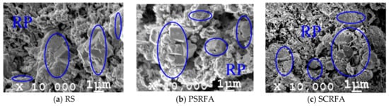 It can be observed from Figure 7 that no CH crystals were detected in the three groups of samples, but all the unhydrated RP particles were observed. The number of unhydrated RP particles in the three groups of samples, in descending order, is SCRFA dry-mixed masonry mortar, PSRFA dry-mixed masonry mortar, and RS dry-mixed masonry mortar. This is mainly because RP has similar hydration activity to fly ash [,]. It can be secondarily hydrated with CH to form a gel to provide strength for the sample, but the amount of CH produced by the cement′s own hydration is not enough to support the consumption of the RP’s complete secondary hydration, so there will be some RP particles in the sample. In addition, the compactness of RS dry-mixed masonry mortar is similar to that of PSRFA dry-mixed masonry mortar, while the compactness of SCRFA dry-mixed masonry mortar is lower. This is due to the physical defects of the SCRFA and PSRFA themselves, so that the water consumption of dry-mixed masonry mortar prepared by SCRFA and PSRFA will increase when the consistency is 70–80 mm. The increase in water consumption will lead to an increase in the water-binder ratio, which will reduce the compactness of the mortar hydration product. However, because the performance of PSRFA is similar to RS, the water consumption of PSRFA dry-mixed mortar and RS dry-mixed mortar are also similar, and the water-binder ratio of the mortar is not much different. Therefore, the compactness of PSRFA dry-mixed masonry mortar is similar to that of RS dry-mixed masonry mortar. This is consistent with the above-mentioned performance analysis and effectively verifies its validity.